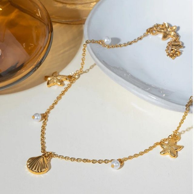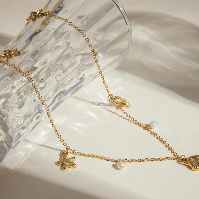 18K Gold Plated Minimalist Starfish Shell Necklace with Imitation Pearls