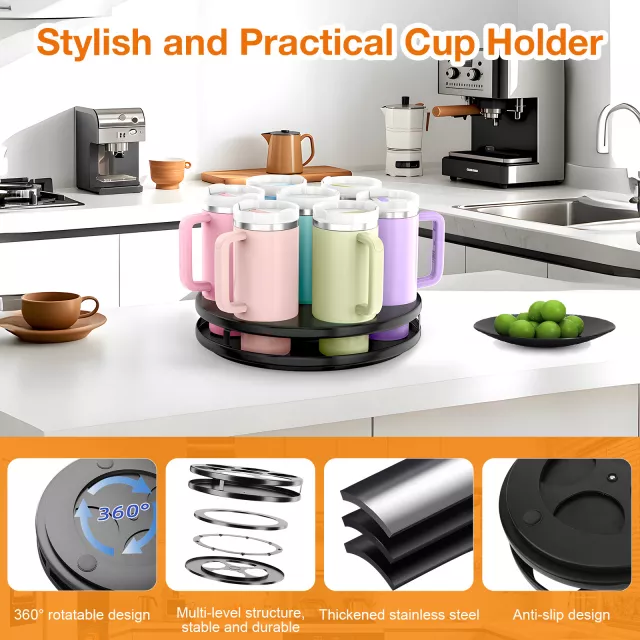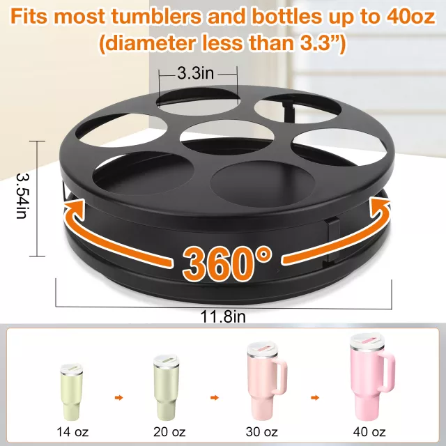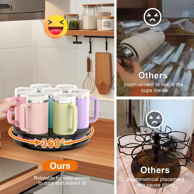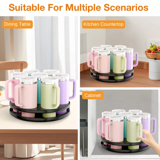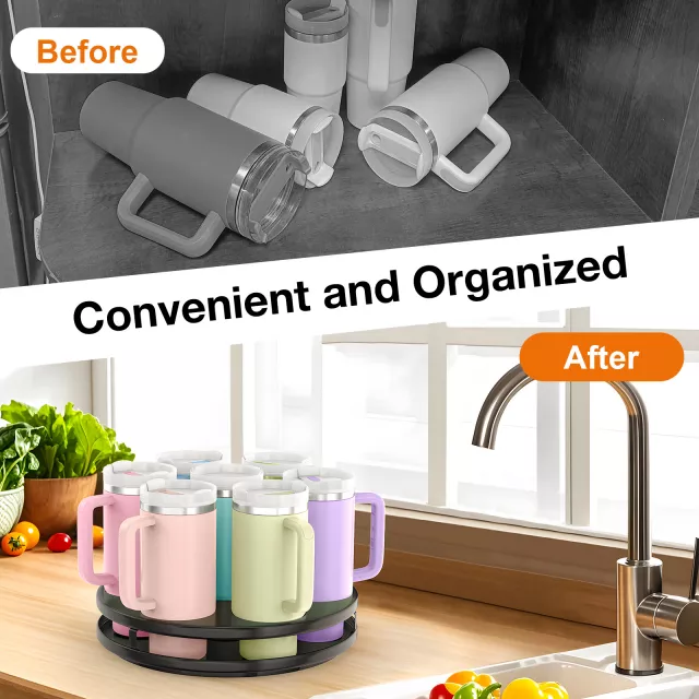 Transform your space and keep your drinkware perfectly arranged with this easy-to-use, rotating tumbler organizer. It’s time to take your organization to the next level—grab yours now and enjoy a clutter-free, more efficient kitchen!