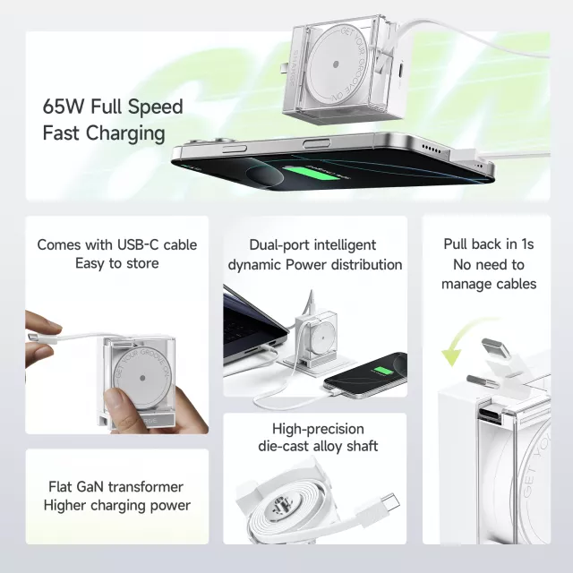 Unlike traditional chargers, this one comes with an integrated retractable cable, eliminating clutter and ensuring you never forget your cord. The advanced GaN technology provides high-speed charging while keeping the charger cool and energy-efficient. Plus, with built-in foldable prongs, you can store it easily without worrying about damage.