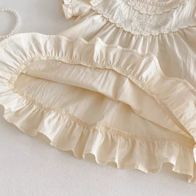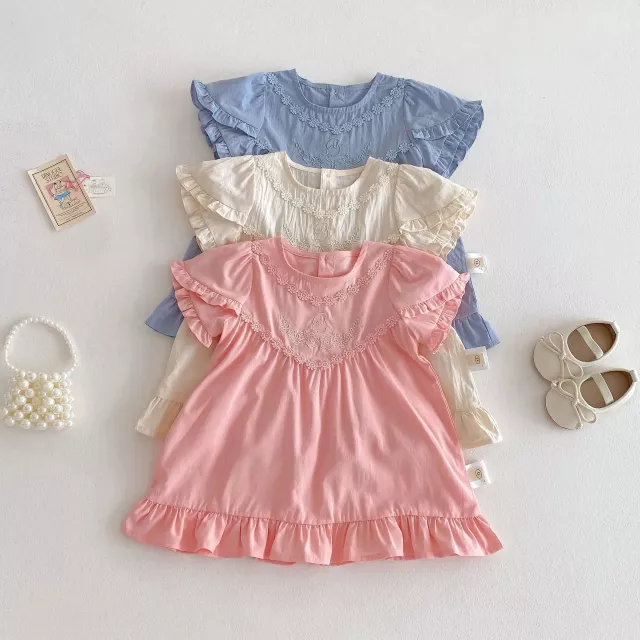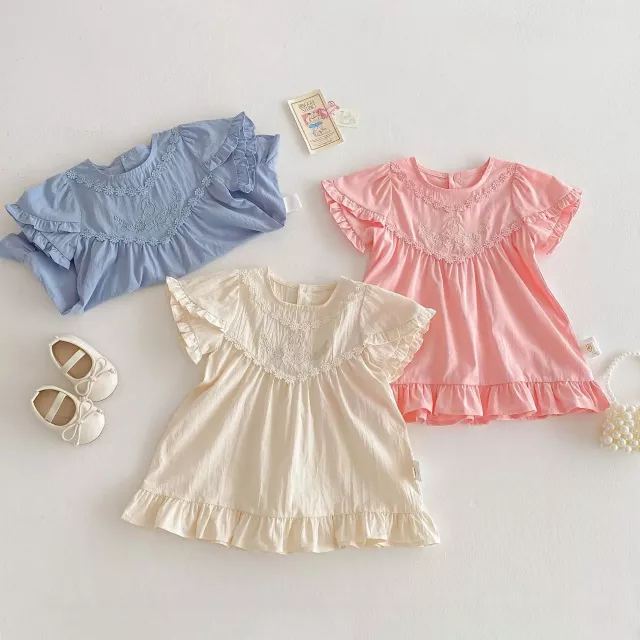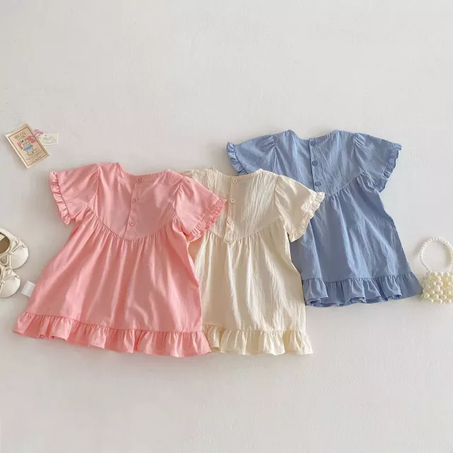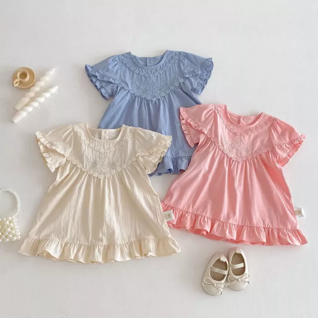 What makes this dress truly stand out is its delicate lace-trimmed collar and elegant floral embroidery, giving it a classic, fairy-tale feel. The petal sleeves and ruffled hem add a soft, playful touch, making it a favorite for girls who love to twirl. Available in sweet shades of pink, light blue, and beige, it’s easy to pair with sandals, sun hats, or cute hair bows for a complete summer look.