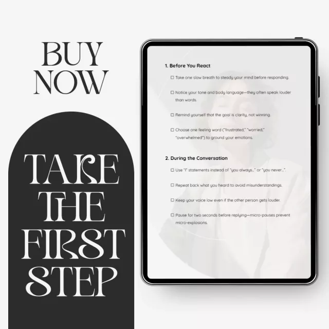 The Calm in the Moment Checklist is a simple, powerful digital guide designed to help you stay grounded, communicate clearly, and break reactive habits during emotionally charged moments. Whether you’re navigating relationship tension, workplace stress, or overwhelm in daily life, this printable and screen-friendly checklist gives you step-by-step support you can use instantly. Created for anyone seeking emotional regulation, mindful communication, and more peaceful interactions, this guide brings clarity when you need it most.