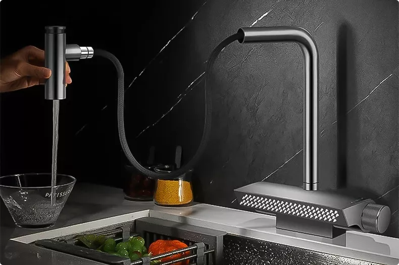 This faucet has been a fantastic addition to my kitchen renovation. The sleek, modern design pairs beautifully with the functionality of the pull-out sprayer. The water flow creates a stunning waterfall effect that's both beautiful and practical. It's made from high-quality materials, ensuring durability. Installation was a snap, and it has significantly improved my daily kitchen tasks. It's not just a faucet; it's a statement piece that elevates the entire room