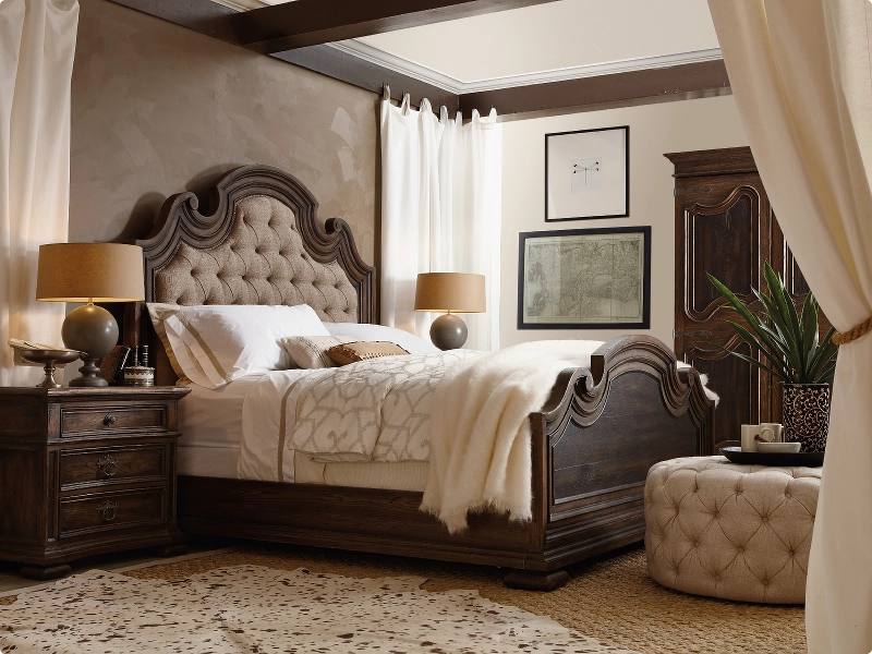 Crafted with meticulous attention to detail, this bed features an exquisite button-tufted upholstered design, set against an elaborately carved and shaped headboard and footboard. The fusion of an aged black finish at the heart of the footboard and a timeworn saddle brown on the headboard and footboard’s carved border exudes a vintage charm.