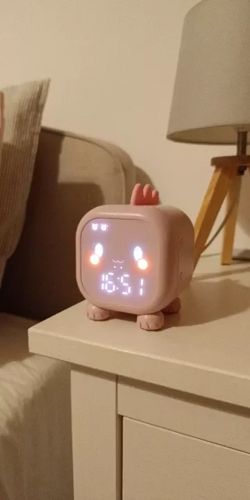 Bought it for my 6-year-old girl, and she really liked it. The setup isn't entirely intuitive; you need to read the instructions, but once set, it's easy to use. The alarm volume and types are nice and adjustable. The screen turns off after 20 seconds of inactivity but reactivates with a simple touch or surface vibration.