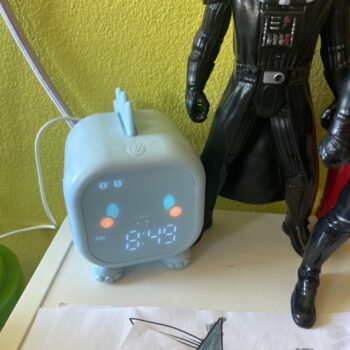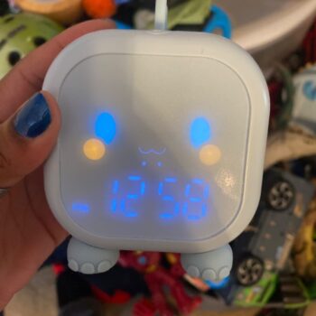 This alarm clock is super fun for kids. Set it up for our 6-year-old who needed help waking up for school. Offers six different alarm sounds and volume control, and you can set it for a 5, 6, or 7-day schedule.