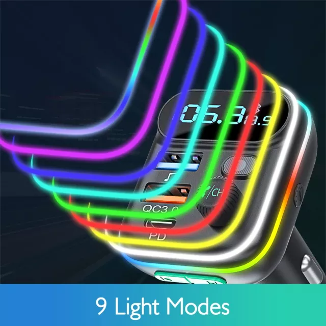 Transform your car’s audio system with this Bluetooth FM transmitter. Whether you want to listen to your favorite tunes, charge multiple devices on the go, or make hands-free calls, this device does it all. Offering an ultra-secure connection with Bluetooth 5.0, it ensures smooth and stable streaming of music, making it perfect for those long drives or daily commutes. The advanced charging technology, including a Type-C PD port and QC 3.0 USB ports, allows you to power your devices faster than ever before. Plus, the 9-color LED light display adds a fun and vibrant touch to your vehicle’s interior.