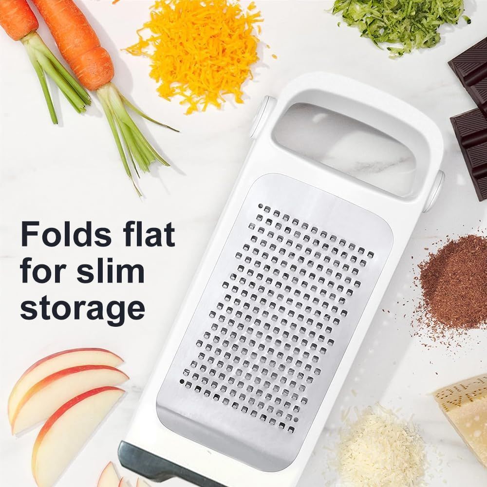 As someone with limited kitchen space, this grater has been a fantastic find. Its foldable design makes it easy to store, and the sharp blades make quick work of grating tasks. The added safety of the blade covers is a thoughtful touch. Overall, it's a durable and practical kitchen tool