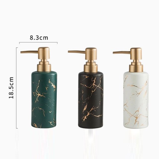 Gold Plated Ceramic Lotion Bottle. This stunning soap dispenser not only serves its practical purpose but also acts as a decorative accent that enhances your interior decor. With its exquisite marbled design and gold plating, this bottle is the perfect blend of style and functionality, complementing any modern or classic bathroom setting.