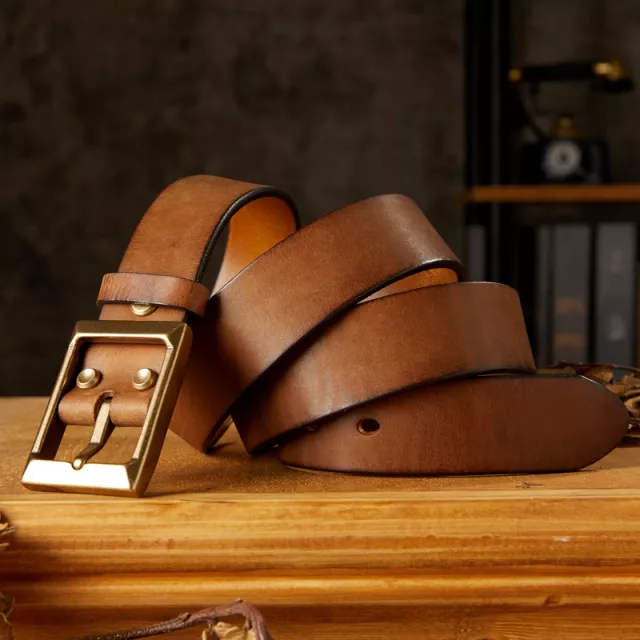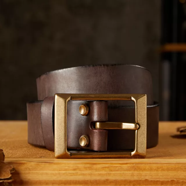 Featuring a solid design with a 4cm (1.57 inches) width, this leather belt provides both comfort and strength. The copper pin buckle adds a rustic yet refined touch, making it a standout piece in your accessory collection. Its simple and versatile style makes it ideal for pairing with jeans, chinos, or even casual trousers.