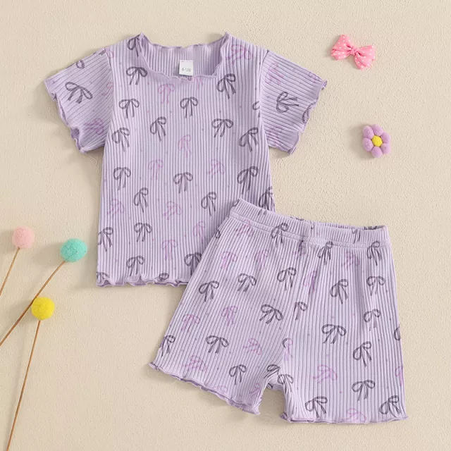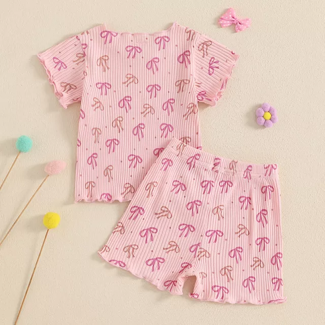 Looking for the perfect outfit to keep your little one cute and comfy all summer long? This charming 2-piece shorts set for girls is made to impress. Featuring a ribbed short sleeve T-shirt with a sweet bow print and lettuce trim, paired with matching elastic-waist shorts, this outfit is a go-to for warm weather fun. Whether she’s playing in the park, attending a birthday party, or just hanging out at home, your little girl will love how soft, breathable, and stylish this outfit feels.