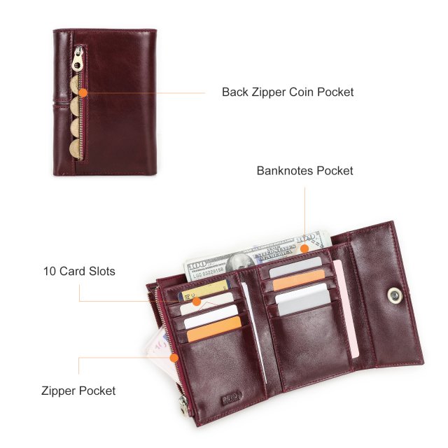 • Multiple Compartments: Designed to keep you organized, the wallet features a **note compartment**, **card holder**, **coin pocket**, and a **zipper pouch** to securely store your cards, cash, and small change.