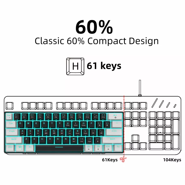Elevate your typing and gaming experience with this sleek and ergonomic 60% mechanical keyboard. Designed to enhance performance without sacrificing style, it’s perfect for gamers, office workers, and anyone seeking precision and comfort. Featuring a responsive mechanical key feel with blue switches, it’s the ideal solution for a smooth, satisfying typing experience, whether you’re typing up a document or immersed in an intense game.