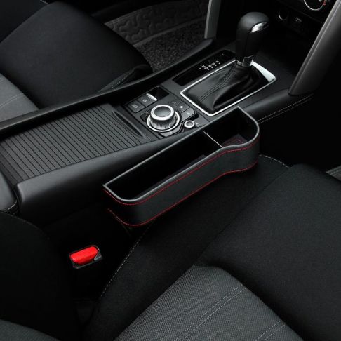 Our Multifunctional Car Seat Organizer fits into the space between your car seat and center console for an out-of-the-way storage accessory that also is conveniently within reach. Our Multifunctional Car Seat Organizer features a coin holder, curved spot to hold a tumbler or drink, and even built-in ports to facilitate flow of charger cables for devices. Plus, a luxe black, expert-crafted PU leather design (with visible red stitching detail) adds a stylish touch that blends into just about any car interior. Above all, our organizer is easy to install: just insert into the space between your seat and center console — no drills or attachment clips required. It’s a high-crafted solution to help tidy up your ride.
