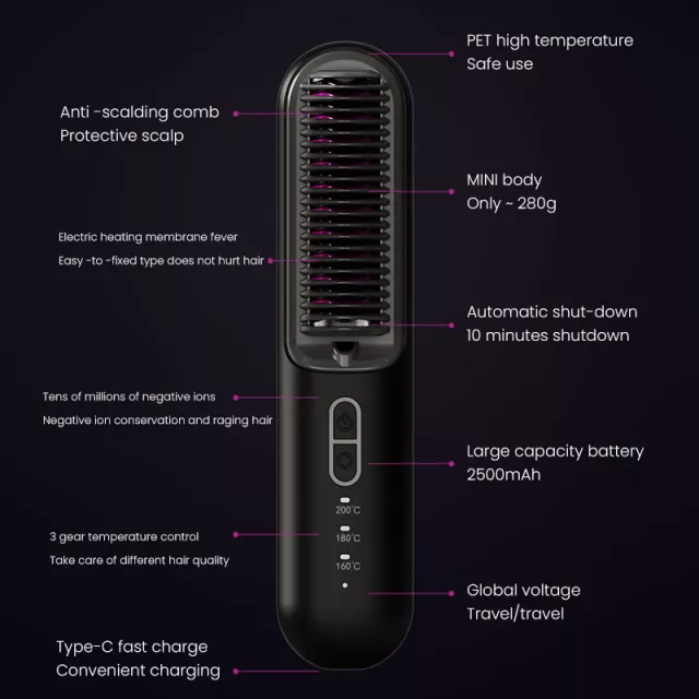 This hair straightener comb is more than just a styling tool—it’s a game-changer for anyone looking to simplify their hair routine. Whether you need to smooth out some frizz before a big meeting or touch up your hair after a long day, this tool is designed to meet your needs in a flash. Its cordless design makes it perfect for on-the-go styling, while its advanced features ensure that you get long-lasting results every time. No more struggling with tangled cords or bulky straighteners—this sleek, portable comb is all you need for flawless hair, wherever you are.