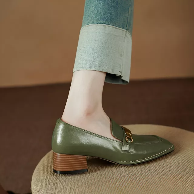 Featuring a sleek square toe and a sturdy chunky heel, these pumps provide a modern and versatile look that pairs beautifully with dresses, skirts, or tailored pants. The metal buckle detail adds an extra layer of elegance, making these loafers stand out as a statement piece while maintaining their classic appeal.