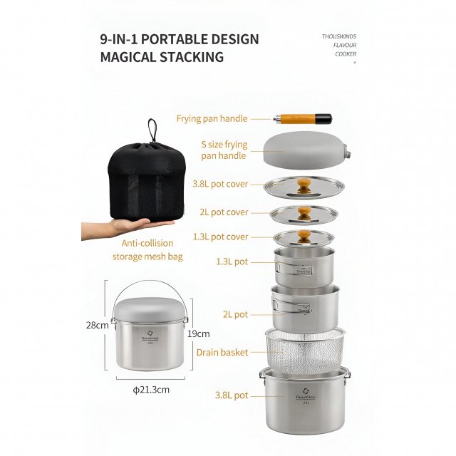 Crafted from high-quality 304 stainless steel, this cookware set is built to last and withstand the toughest outdoor conditions. The set includes everything you need: pots in various sizes (1.3L, 2L, 3.8L, and 6.5L), a frying pan, mesh basket, and more. All items are easy to clean, portable, and come with a convenient mesh bag for simple storage and transport. Whether you’re cooking over a campfire or using a stove, this versatile set is a must-have for any outdoor cooking enthusiast.