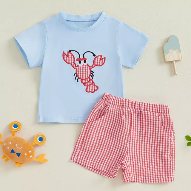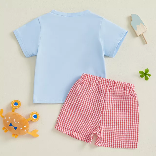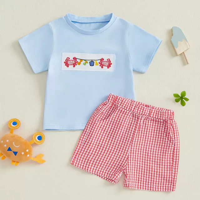 Toddler Summer Outfit with Crab Embroidery T-Shirt and Plaid Shorts Set
